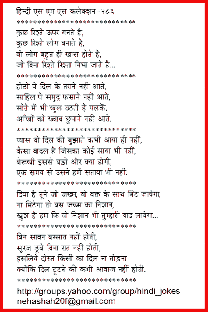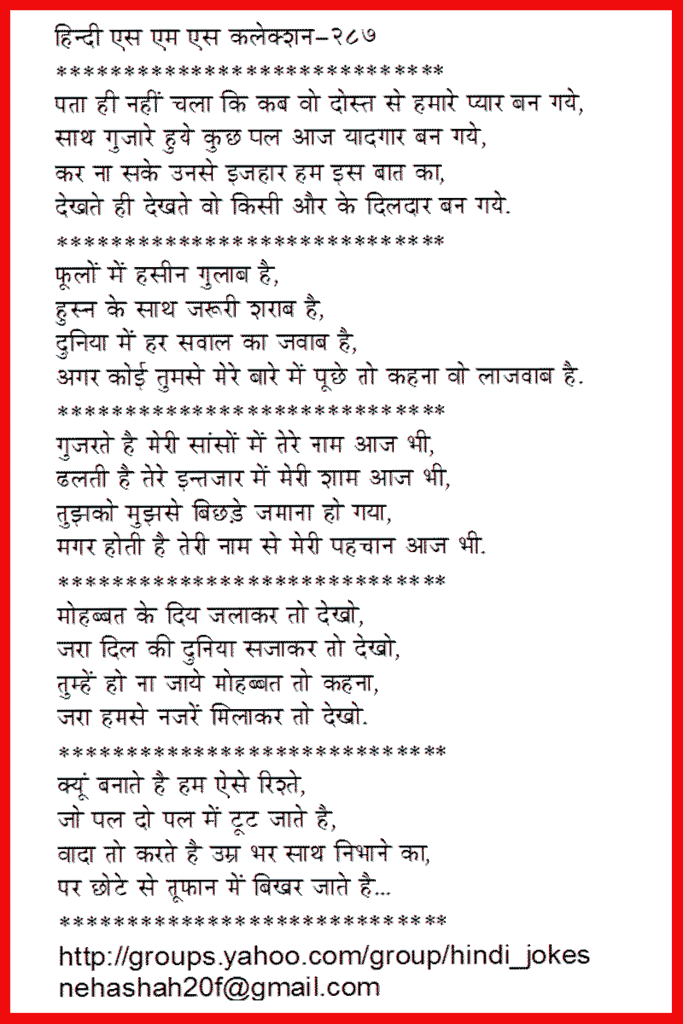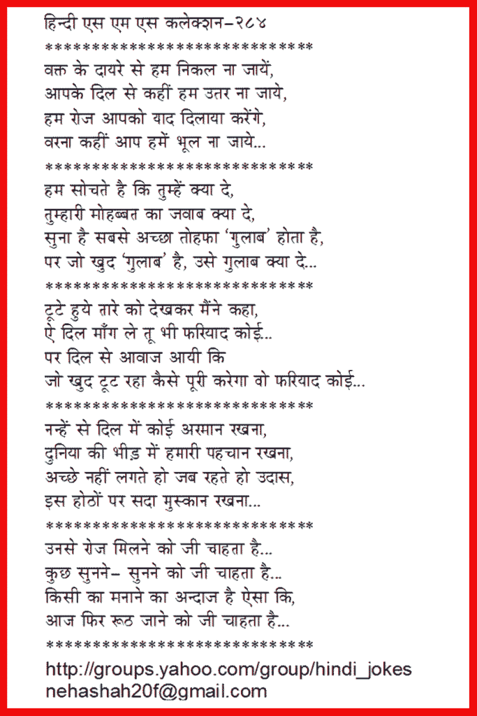 ************ Waqt ke daayre se ham nikal na jaaye, Aapke dil se kahi ham utar na jaaye, Ham roj aapko yaad dilaya karenge, Varna kahi aap hame bhool na jaaye... ************ Ham sochate hai ki tumhe kya de, Tumhaari mohabbat ka jawaab kya de, Suna hai sabse acha tohfa `gulaab' hota hai, Par jo khud `gulaab' hai, use gulaab kya de... ************ Tute huye taare ko dekhkar maine kaha, Ae dil maang le tu bhi phariyaad koi... Jo khud tut raha kaise poori karega wo phariyaad koi... ************ Nanhe se dil me koi armaan rakhna, Duniya ki bheed me hamaari pahchaan rakhna, Achhe nahi lagte ho jab rahte ho udaas, Is hotho par sada muskaan rakhna... ************ Unase roj milane ko jee chahta hai... Kuch sunane- sunane ko jee chahta hai... Kisi ka manaane ka andaaj hai aisa ki, Aaj phir ruth jaane ko jee chahta hai... ************